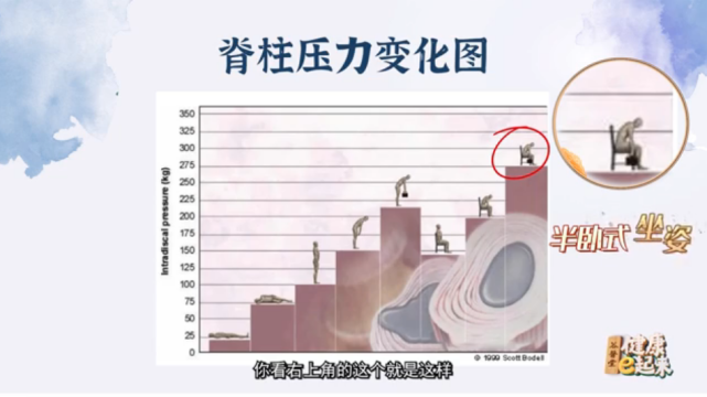 半卧式坐姿对腰椎压力最大,其次是搬重物、久坐、长时间弯腰或者连续多次弯腰等。
